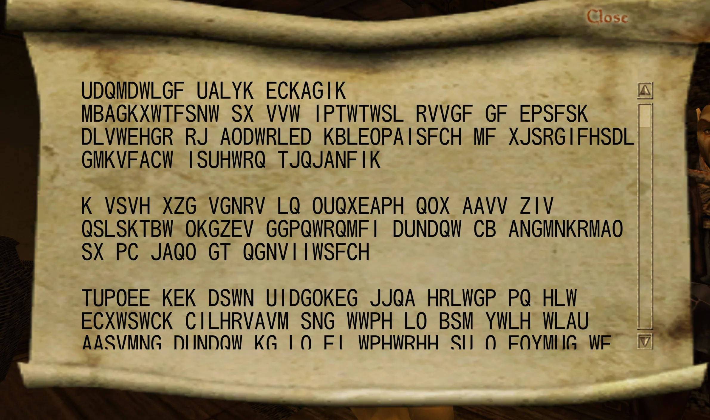 巻物を開くと、本来はデイドラ文字(架空の文字)で書かれるべき部分が、普通の英語で表示されていた。