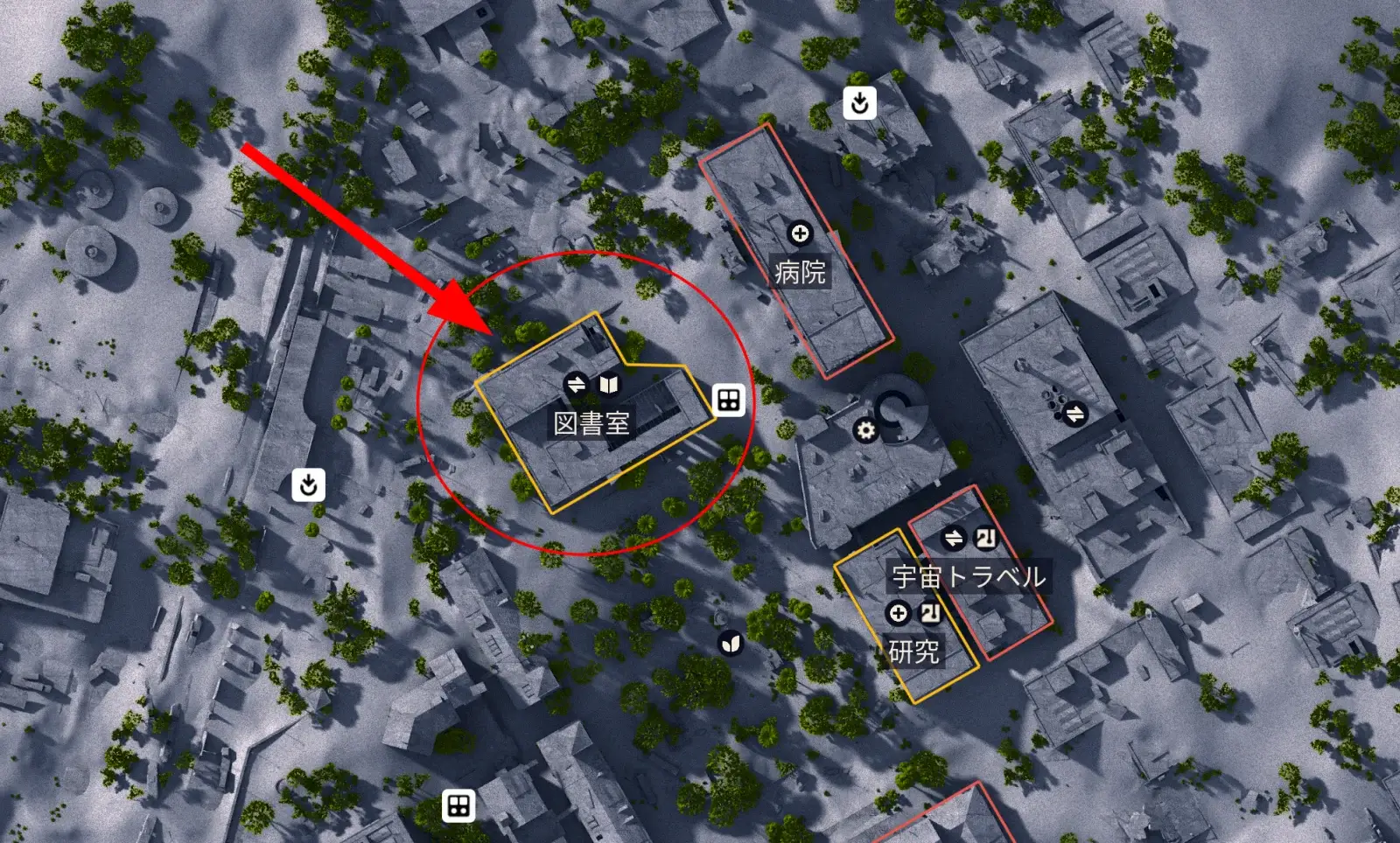 - マッチ開始時に埋もれた街側にスポーンできたら、マップ上で大きな建物アイコンの図書館を目印に移動する。