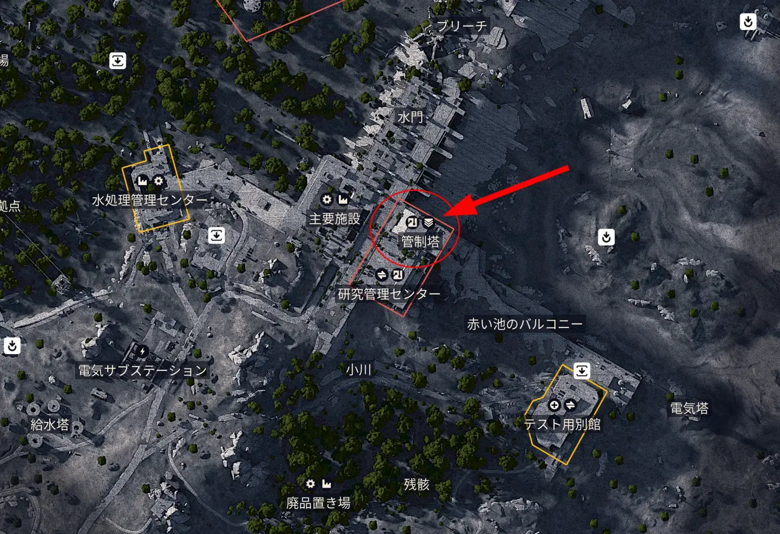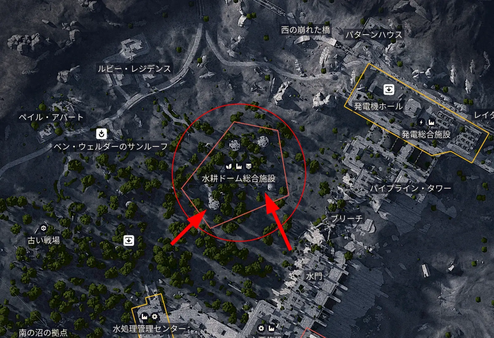 - 目印はマップの「水耕ドーム総合施設」。大きめの建物群がターゲット。