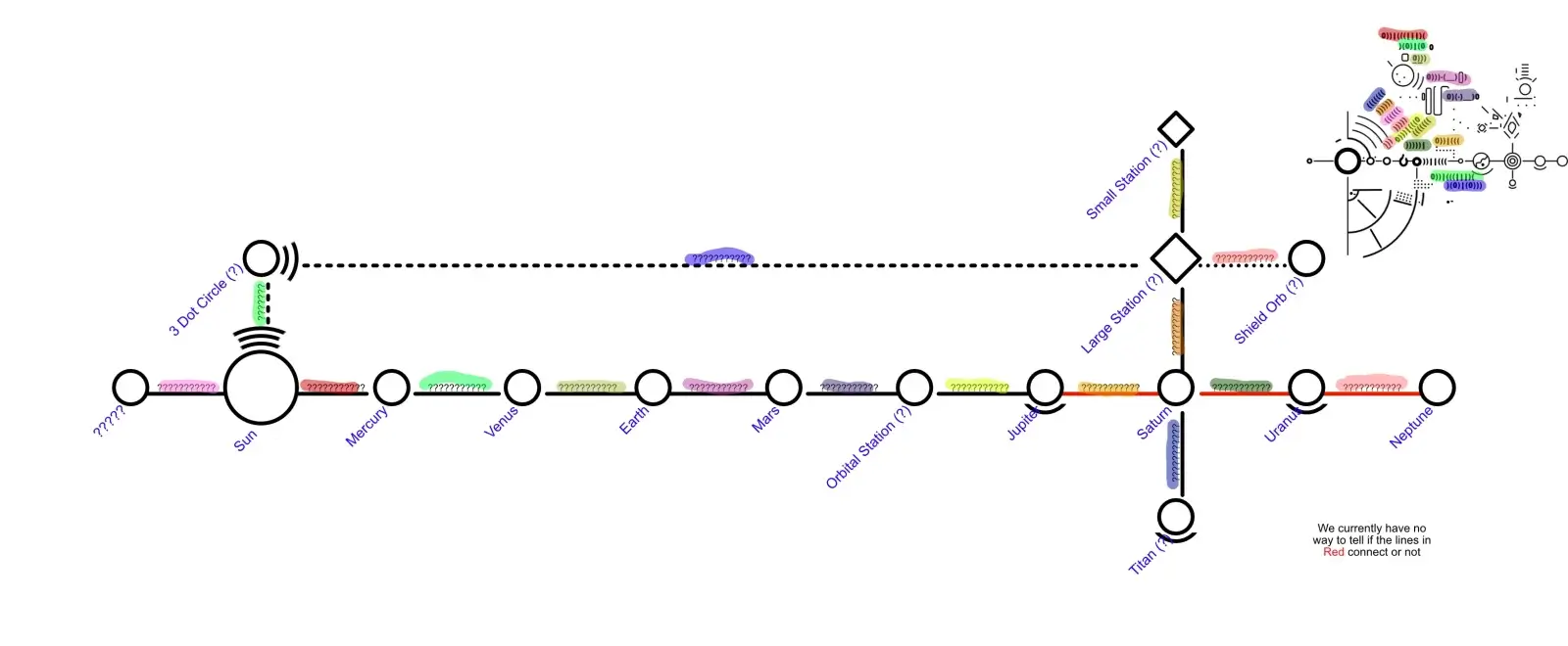 - 太陽から 3つの点のある円、土星上空のステーションを経由して、木星・タイタン・天王星へ信号が流れている