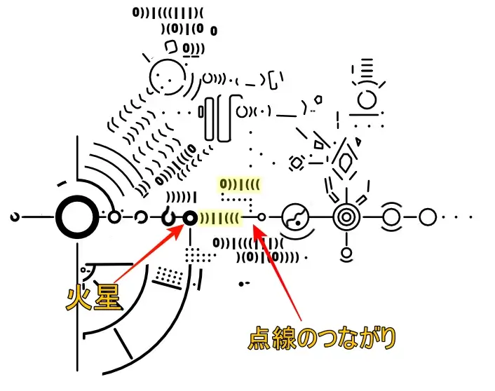この図を面白くしているのは、惑星同士をつなぐさまざまな線と、その周囲にびっしり描かれた「謎のシグナル」です。