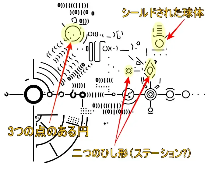 ステーション二つについては、軌道上の巨大施設か中継基地を表しているだろう、というあたりまでは共通認識に近いです。