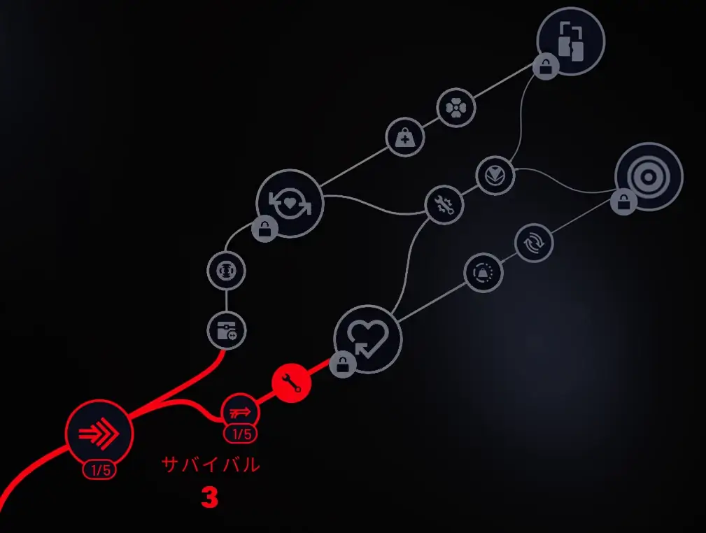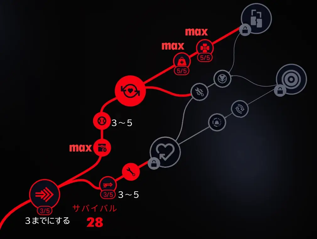 【移動性】に振って走り回れるようになったら、サバイバルに切り替えていきます。目標は最奥の「セキュリティ突破」です。ここまで行くのに36ポイントほど必要なので、【移動性】スキルツリーを触ったぶんを考慮するとレベル30台くらいからが本番になります。